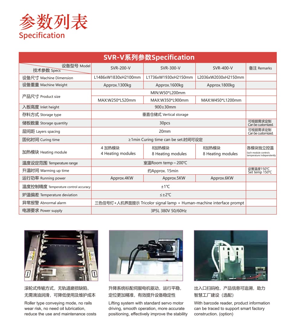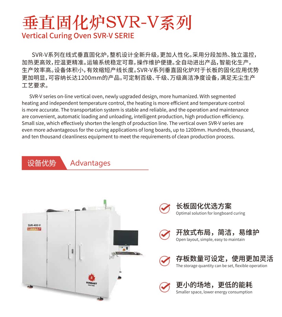 SVR-V系列在線式垂直固化爐,整機設計全新升級,更加人性化。采用分段加熱、獨立溫控,加熱更高效,控溫更精準。運輸系統穩定可靠,操作維護便捷。全自動進出產品,智能化生產,生產效率高。設備體積小,有效縮短產線長度。SVR-V系列垂直固化爐對于長板的固化應用優勢更加明顯,可容納長達1200mm的產品??啥ㄖ瓢偌?、千級、萬級高潔凈度設備,滿足無塵生產工藝要求。