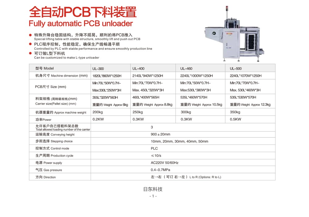 全自動PCB下料機介紹:特殊升降臺穩固結構,升降不搖晃,順利的獎PCB推入。PLC程序控制,性能穩定,確保生產線暢通平順。可訂做L型下料機。