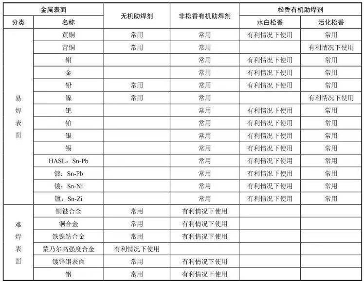 ②有利條件下使用:在表面無嚴(yán)重的銹膜或類似的污染時,可用水白松香助焊劑。通常這類金屬表面可用活化松香或非松香有機(jī)材料助焊劑進(jìn)行焊接。