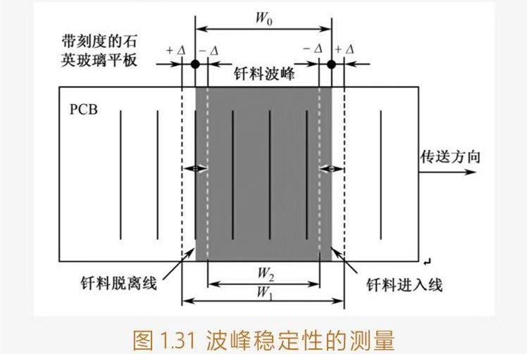 ③測試方法:將波峰高度調(diào)節(jié)至正常工作的高度H0上,然后將帶刻度的石英玻璃平板裝夾在傳送鏈上,將其運行至釬料波峰上調(diào)節(jié)好浸入深度,如圖131所示。觀測由于波峰高度的波動而導致玻璃平板上釬料波峰的進入線和脫離線之間闊度的變化[W2(Wo-2△)-Wo-W1(W0+2△)]。