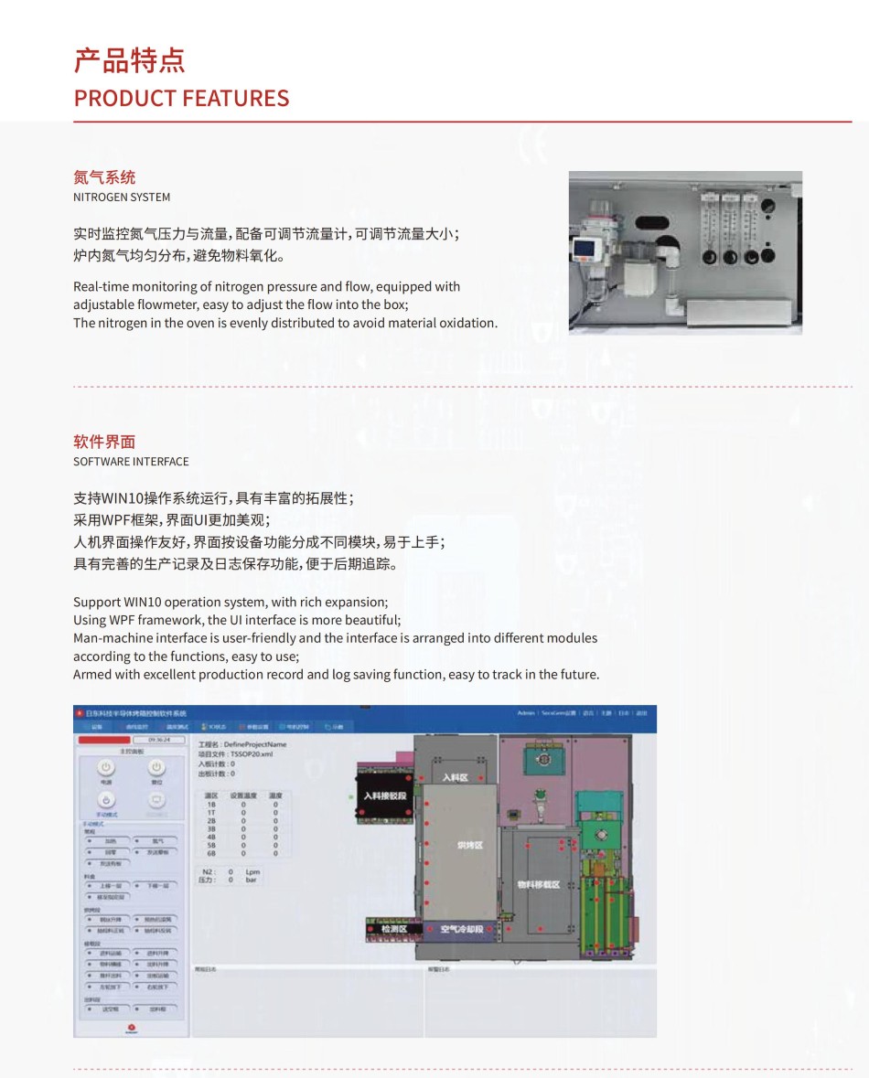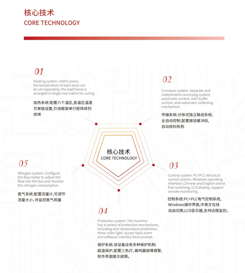 加熱系統:配置六個溫區,各溫區溫度可單獨設置,引線框架單行矩陣排列烘烤。