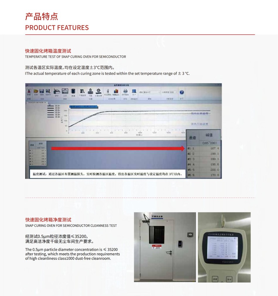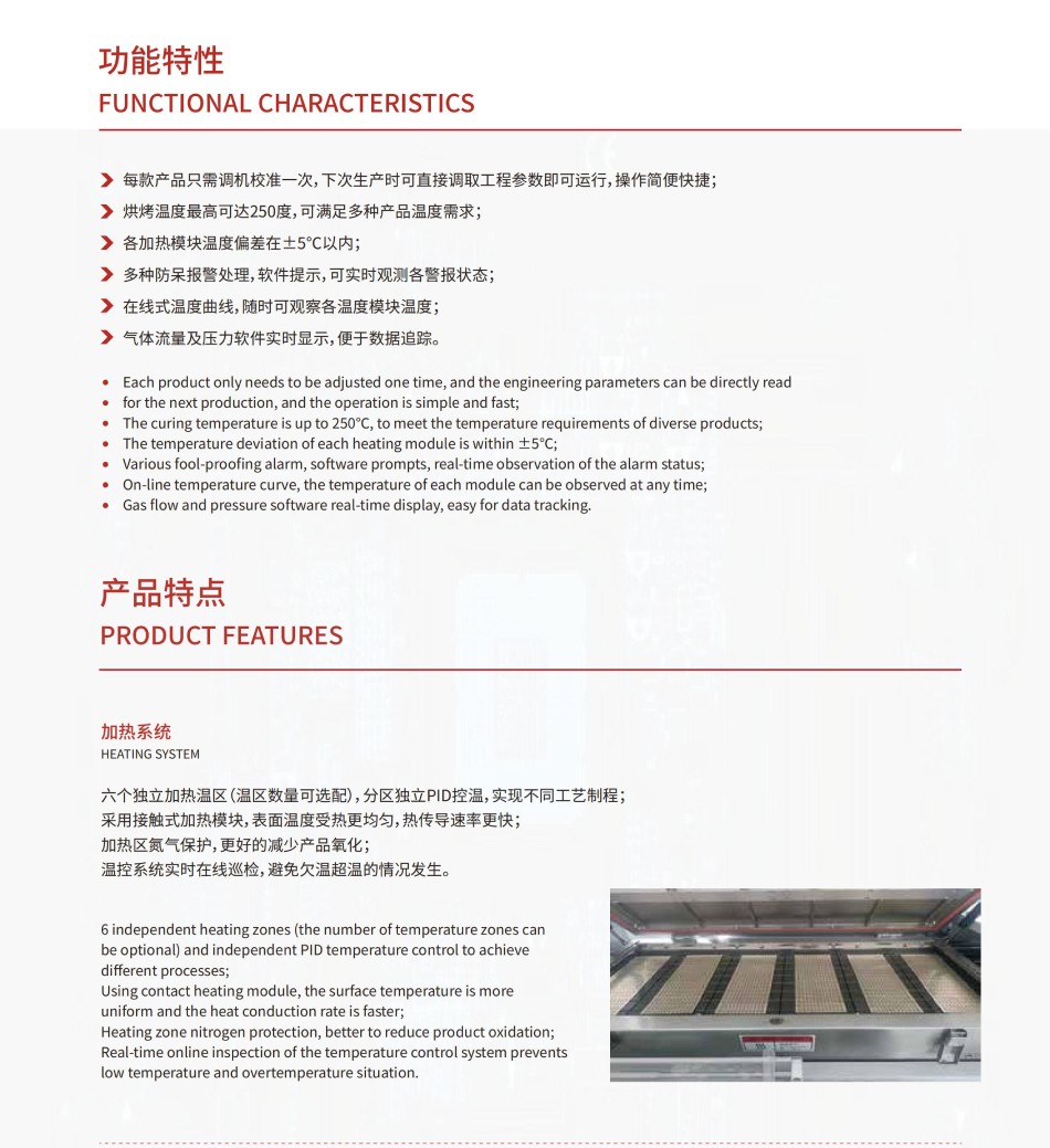 烘烤溫度最高可達250度,可滿足多種產品溫度需求;各加熱模塊溫度偏差在±5°C以內;