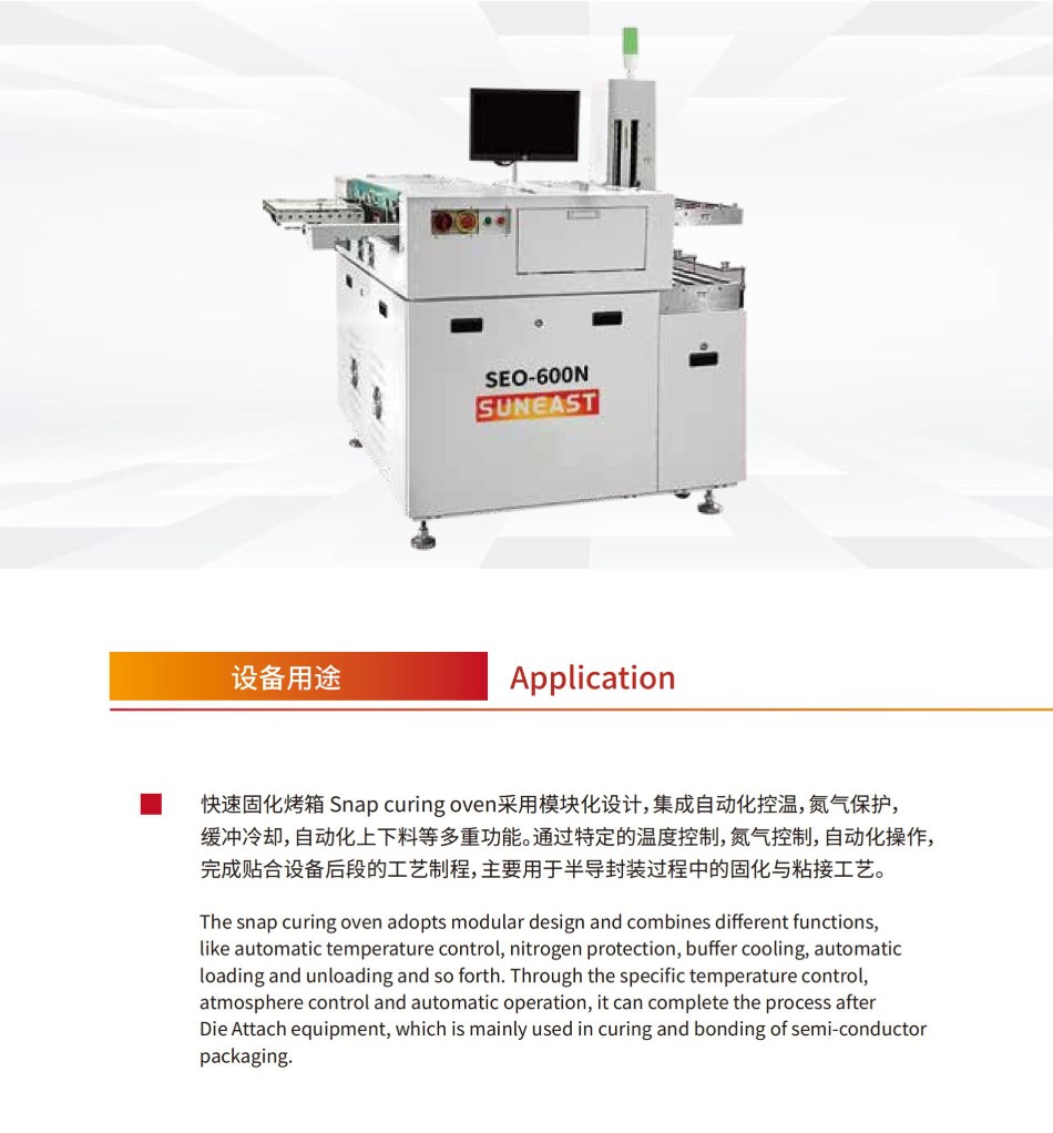 快速固化烤箱SE0-600N采用模塊化設計,集成自動化控溫,氮氣保護,緩沖冷卻,自動化上下料等多重功能。通過特定的溫度控制,氮氣控制,自動化操作,完成貼合設備后段的工藝制程,主要用于半導封裝過程中的固化與粘接工藝。