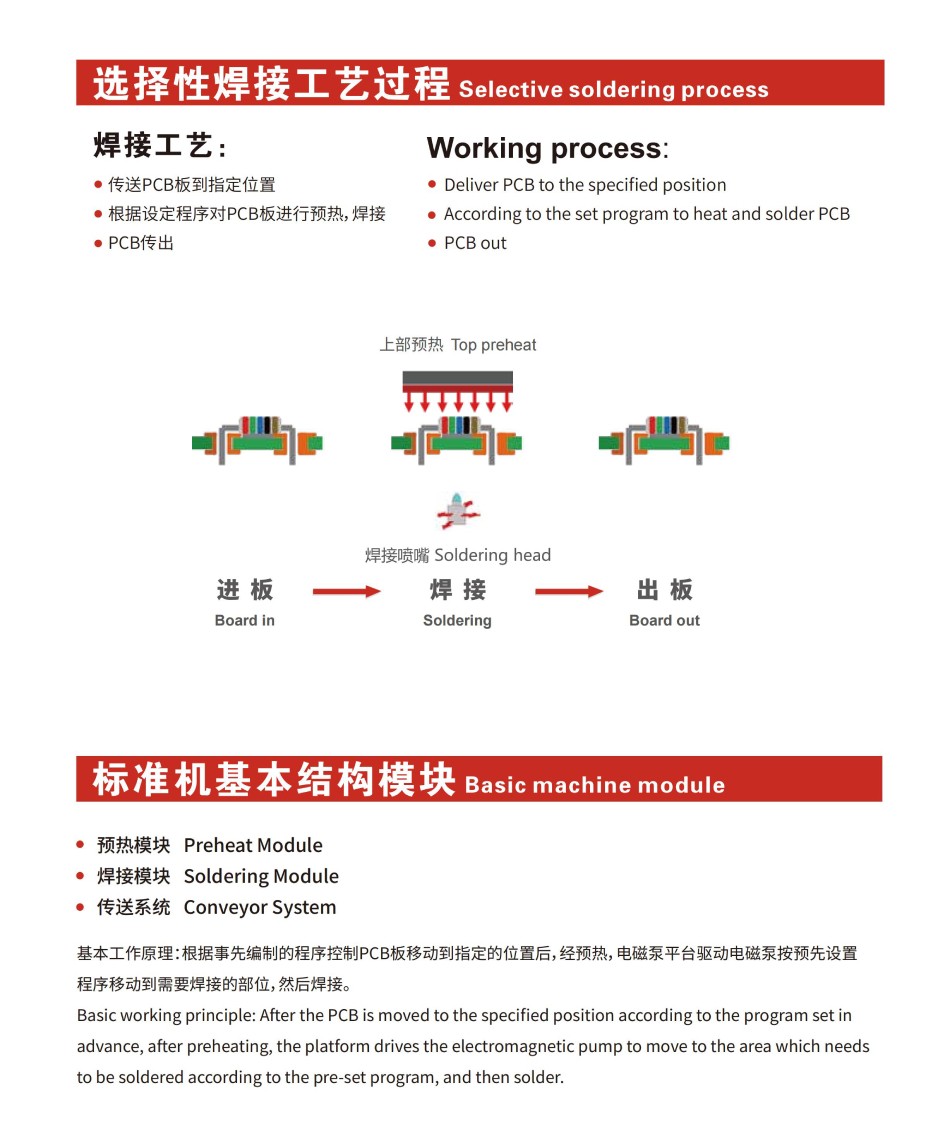 基本工作原理:根據(jù)事先編制的程序控制PCB板移動到指定的位置后,經預熱,電磁泵平臺驅動電磁泵按預先設置程序移動到需要焊接的部位,然后焊接。