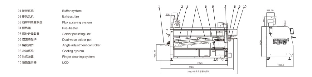 ●錫爐采用外熱式加熱,錫爐內(nèi)膽采用鑄鐵制作,內(nèi)表面防腐蝕處理,兩個(gè)低流速噴口、低氧化量設(shè)計(jì);